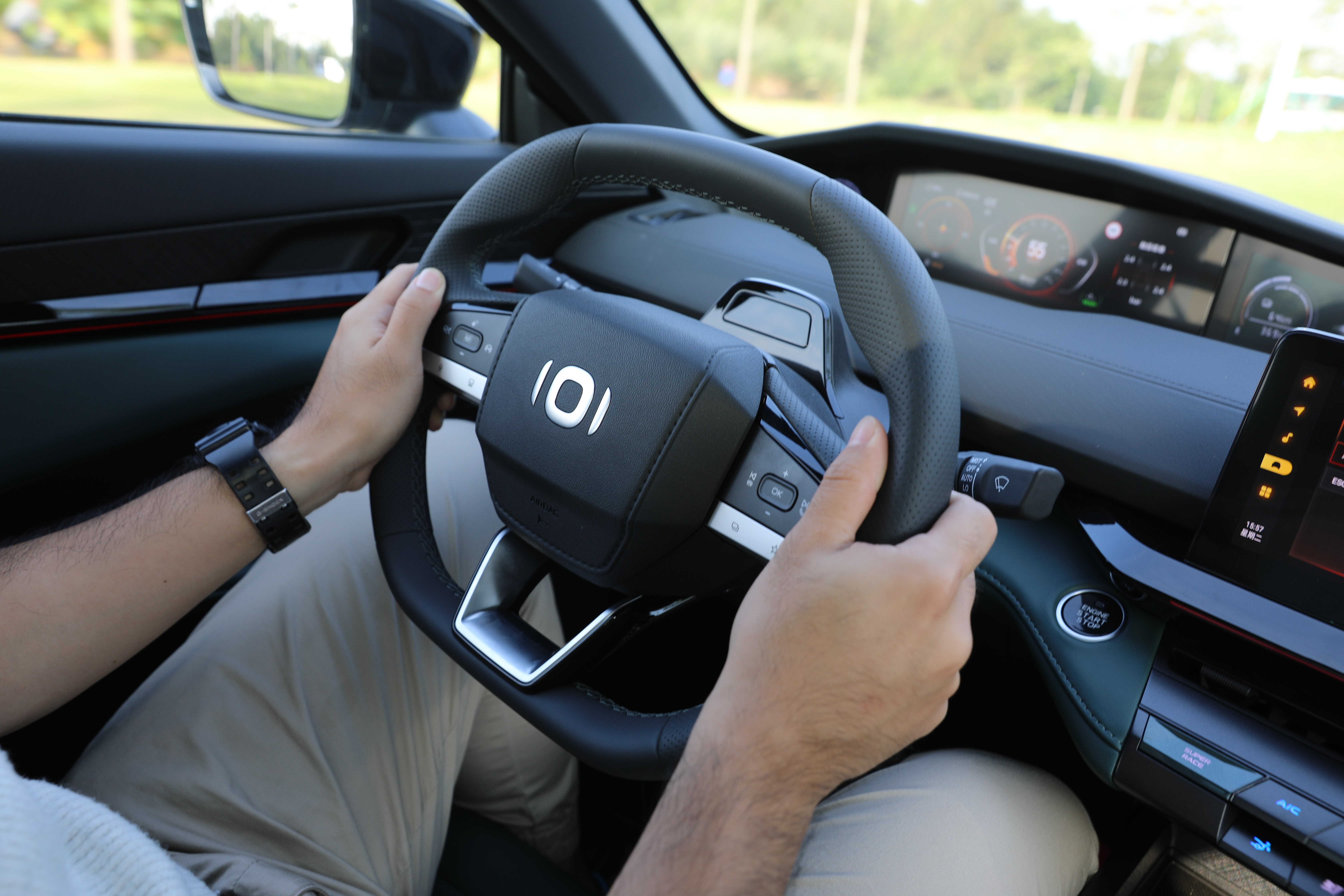 智能驅(qū)動模式能夠幫助車輛在不同電量狀態(tài)下,以最優(yōu)的驅(qū)動結(jié)構(gòu)對動力進行分配,而當筆者啟動SUPER RACE模式,首先映入眼簾的是儀表盤、中控屏切換到更激進的界面UI,其次,車輛的動力進入到嚴陣以待的狀態(tài),油門響應更為積極,配合模擬聲浪,整車的運動氣質(zhì)完全展現(xiàn)出來。